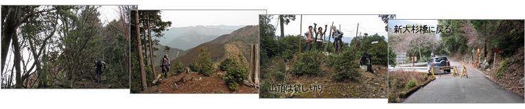09:40 新大杉橋に駐車 → 10:05 倉元橋登山口 (0:25)→ 11:18 尾根分岐 (1:13)→ 11:57 山頂休-憩22分- (0:39)→ 12:42 尾根分岐 (0:45)→ 13:33 倉元橋登山口 (0:51)→ 14:00 新大杉橋 (0:27)