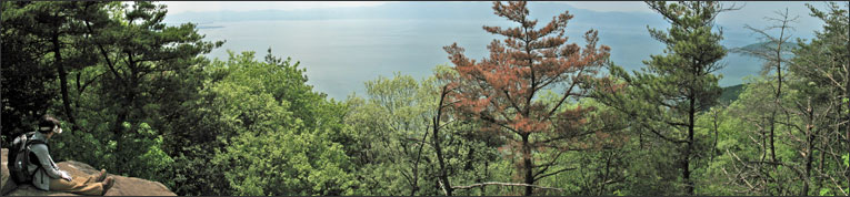 今日の長命寺は大人気で、駐車場が混んでいるのでお寺に関係のない私たちは広い路肩に停めることにしました。今日は時間があるのでゆっくり山頂を目指します。歩いてみると、前回パスして正解で、快適な登山道に最高の展望ポイントとイワカガミの群生!薄暗い中では楽しめなかった事でしょう・・。