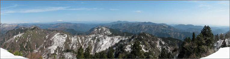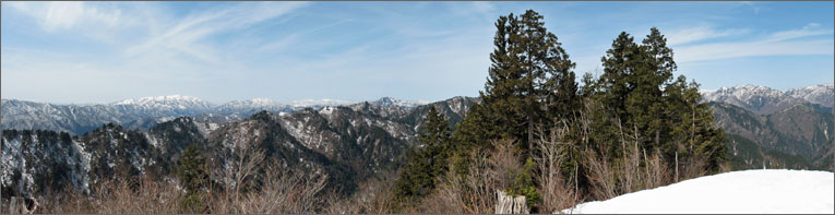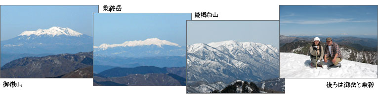 そんな苦労が、山頂の展望で報われます。「御嶽山」も「乗鞍岳」も山の裾野までハッキリと望むことが出来ました。先客の男性の方に記念撮影をお願いしました。いや~っ、本当に素晴らしい展望です。三角点は深い雪の下で、確認することは出来ませんでした。