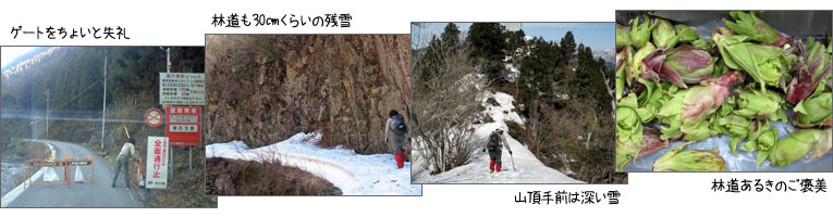 林道から残雪が始まり、結構足をとられてしまいます。これが、登山道に入ると、雪に薮こぎで危険なポイントも多いです。特に山頂手前からは、あまりの雪の多さに吃驚です!場所によっては「腰」まで埋まるほどです。流石に両足がはまると焦ってしまいます。
