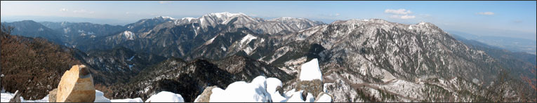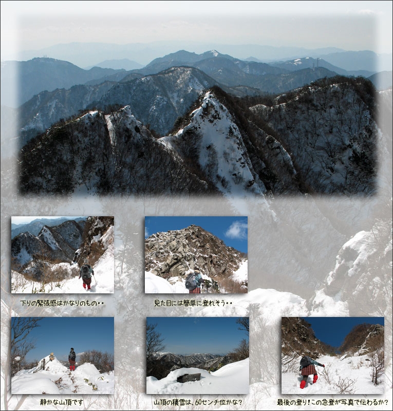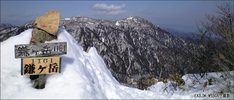 このコースは、2004年4月に逆のコースで歩いてます。今回は雲母Ⅱ峰を目指す予定でしたが、バス停登山口を見逃してしまい、宮妻からのコースでも良いかな?と思ってました。が、思ったより雪が深かく、時間を取られたので、鎌ガ岳に目的地を変更しました。歩いたことのあるコースと言えど、この雪では、初めてのコースとなんら変わりなく、場所によって膝上まである雪は、歩き慣れない私たちにはかなりの強敵でした。