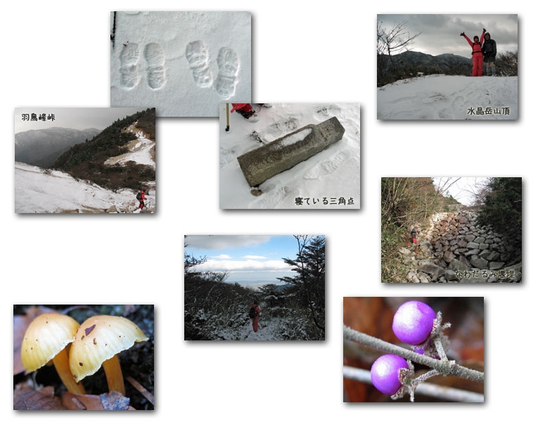 流石にこの季節になると、大きな駐車場もガラガラ、歩いている間も人と出会うことも無く、元気なお兄さんが、私たちの横を駆け抜けただけの静かな山歩きとなりました。私の腰についている、オモチャの様な温度計も常に0℃以下の状態で、下界との温度差は12℃くらいでしょうか・・。歩き始めは、氷が降る登山道でしたが、峠からは粉雪の中を歩くことになりました。