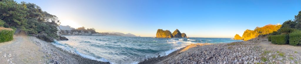 干潮のときだけ海の中から“道”が現れ、三四郎島まで歩いて渡れる非常に珍しい自然現象です。 この現象は 「トンボロ現象」 と呼ばれ、静岡県の天然記念物にも指定されています。沖合約200mにある4つの島の総称で、見る角度によって3つに見えたり4つに見えたりするため「三四郎島」と呼ばれます。