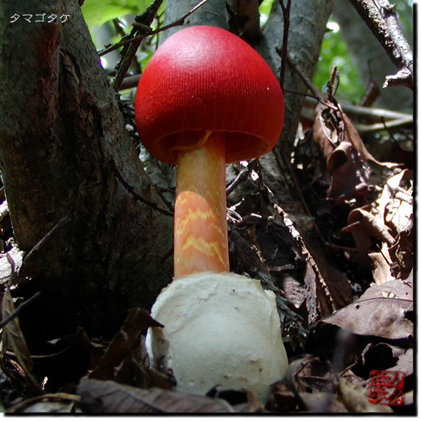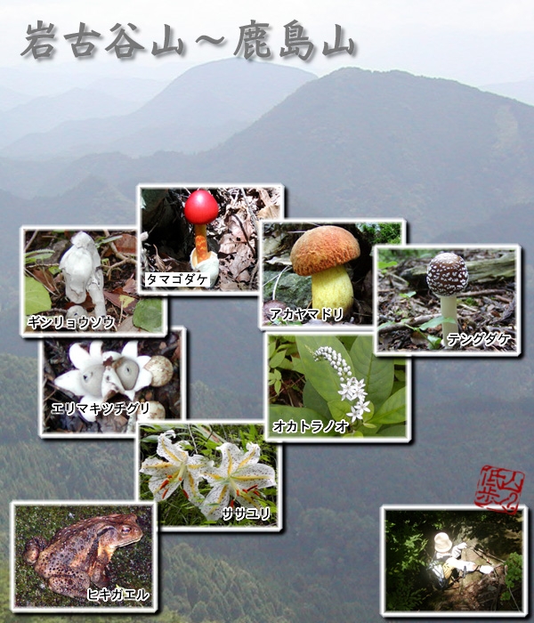 9時55分、岩古谷山山頂に到着。何組かの登山者が展望を楽しんでいました。私は今日もすでに汗だくです。この先が少し不安になりますが、すぐに先へ行こうとするJunちゃんを制止して、しばらく休憩を取ります。歩き始めると、すぐに足元が賑やかになりました。次から次へとキノコたちが現れ、写真撮影が続きます。特に、私たちの大好きなタマゴタケが多いのにはびっくりです。中には、巨大に成長しすぎて自分の重さで倒れてしまったものもありました。岩古谷山からの展望パノラマは素晴らしく、そして足元には可愛らしいタマゴタケが顔を出していました。