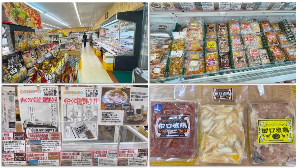 お店の最大の特徴は、自社開発した味付け肉「田口塩鶏」です。設楽町の名倉地区や津具地区には有名な味付け肉がある一方、田口地区にはなかったことから「自分たちで田口の味を作ろう」と店長と仲間たちが試行錯誤して開発しました。 奥三河どりのもも肉やせせりなどを、塩麹と貝柱だしをベースにした特製だれに漬け込んでいます。解凍して焼くだけの手軽さと、ご飯が進む旨味が評判を呼び、テレビや雑誌でも取り上げられる人気商品となっています。