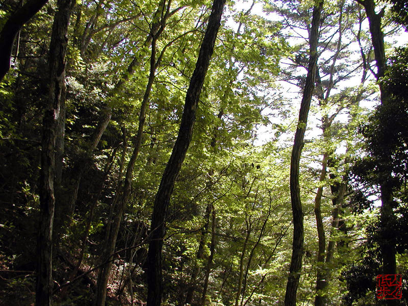 なんとも、寂しい山頂です。小さな空間に三角点がポツリとあるだけで、展望も有りません。記念撮影を済ませ、山頂東側の空間で食事を取る事にします。展望は無いですが、こぼれ日と鳥の声と緑が何よりの贅沢と素直に感じるのでありました。