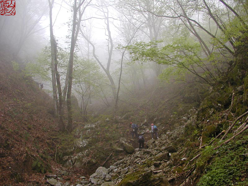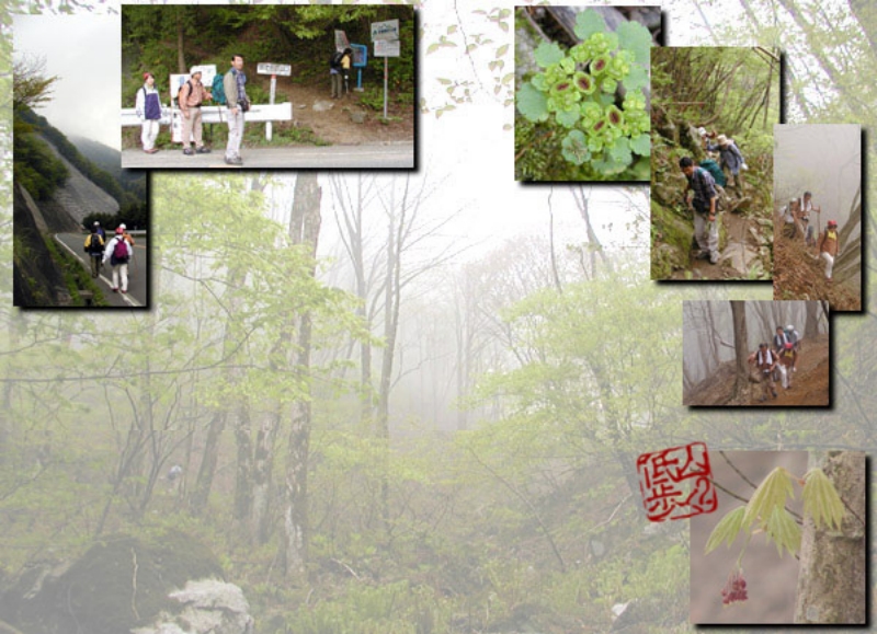 09時33分、長命水で休憩。登るにつれて、ガスが濃くなってきました。「長命水」は癖がなく飲みやすい水でした。ガスは視界を妨げるほどではないので、ハイキングでの問題はありません。しかし、なんとも幻想的な景色です。しばらく休憩を取り先に進みます。前を歩いていた、かなりベテランの女性二人組が植物の解説をしながら歩いているので、自然と情報が入ってきて、こちらも大助かりです(^^) なんか、自動検索の辞書が前を歩いているようでした。今回、よし庵さんの力を入れていた「カタクリ」も山の中腹ではつぼみの状態でしたが、尾根に近づくにつれ、どんどん開いています。おまけにガスもどんどん晴れてきてラッキー! 初参加のHATTORIさんもカメラが趣味のようで、一眼レフで植物の写真を撮っていました。だいぶ私と違って腰つきと腕の安定度がかなりのものです。これは、撮れている結果もかなり違いそうです(^^;)