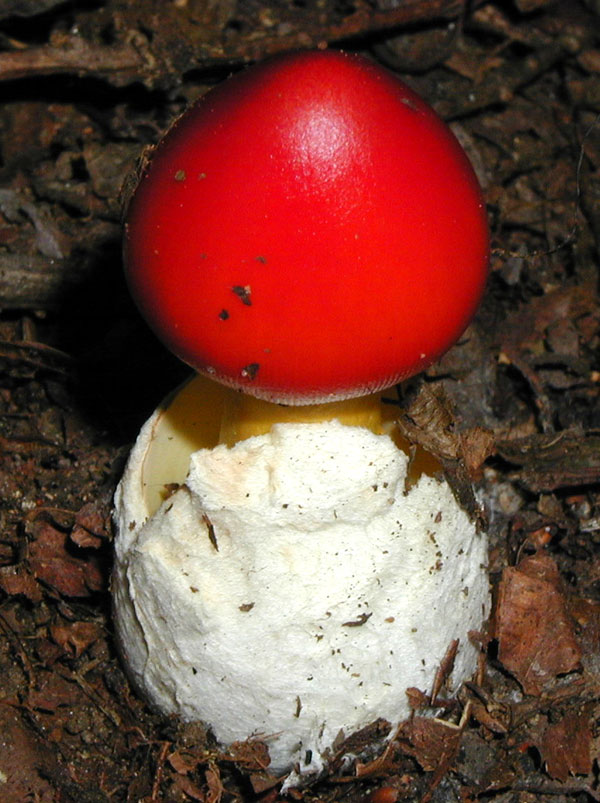 14時36分、竜頭山山頂に到着。残念ながら展望はありませんでしたが、記念の写真を撮り、「小竜頭」を目指します。分岐まで戻り、「小竜頭」への道へ入ると、木々に覆われた道となり、足元に注意が必要です。おかげで、生まれたばかりのタマゴダケに出会うことができました。