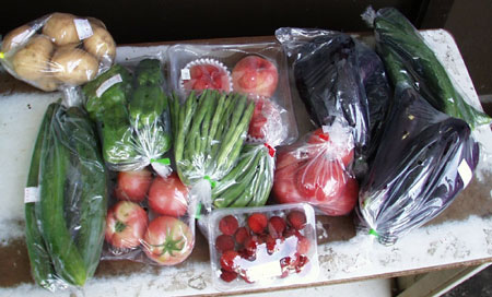 店内には、みずみずしい野菜や果物が所狭しと並んでいます。今回私が購入したのは、ジャガイモ、キュウリ、ピーマン、インゲン、トマト、桃、茄子、山桃、シシトウ。これだけの品数で、なんと合計1200円!新鮮で安い地元野菜は、まさに宝探し。開店時間の9時を待つ間も、地元の人たちとの会話を楽しみました。