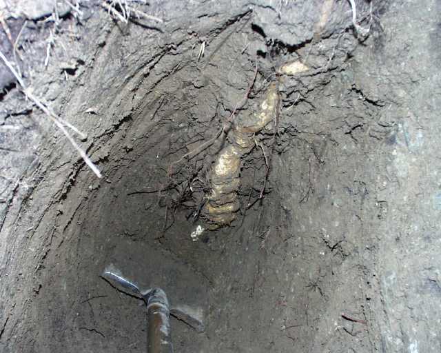 格好を気にせずに、掘りやすい体制で掘る!これが大切な様です・・・ただ、周りの環境で左右されるのが“ヤマノイモ”掘ってみないと形も解らない。まっすぐだったり、曲がったり、以前は延びる方向に岩盤が有って、とぐろを巻いていた事もあったとか‥。 Aしゃんの掘るペースは常人の倍以上速いです。Yやん曰く「Aしゃんは職業を間違えた」私もそう思います!何でこの人、サラリーマンやってんだろ?