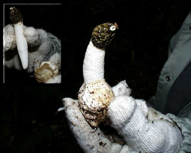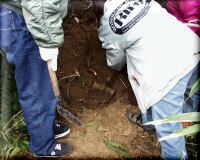 茂みの中から現れたA氏が彼女達の進捗具合を確認し、 「こんなもんやね!!おしまいだ」 つまり、ヤマノイモを取り出す環境まで掘れたと言うことである。そして遂に、一本目を掘り出す事に成功した。一度“ヤマノイモ”を掘ってみたい!と言う彼らの夢が実現した瞬間である。彼らはこの瞬間の、土の臭いと、ヤマノイモの感触、そして、異常にデカイミミズのうねりを忘れる事は無いだろう。この文体は疲れる (^^ゞ