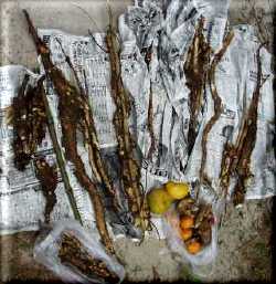 その指示したポイントには木の根の様なものが突起している。ヤマノイモ掘隊の女性陣に堀方を説明するとA氏は山の中に消えていった。土は粘土質であり、乾いたカ所は石の様に硬く、湿り気のあるカ所は粘って・・かなりの力を必要とする。困惑しながらも、指示通りに素直に掘り続ける事30分