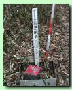 13時11分 三角点、発見! よくあることなのですが…頂上に着いたのに、どうも実感が湧かない!ここもそんな場所でした。残念ながら頂上からの展望はほとんどなく…。おまけに雪もちらちら舞い始め、ちょっと寒い!とりあえず二人で記念撮影を済ませ、南側へと下山することにしました。