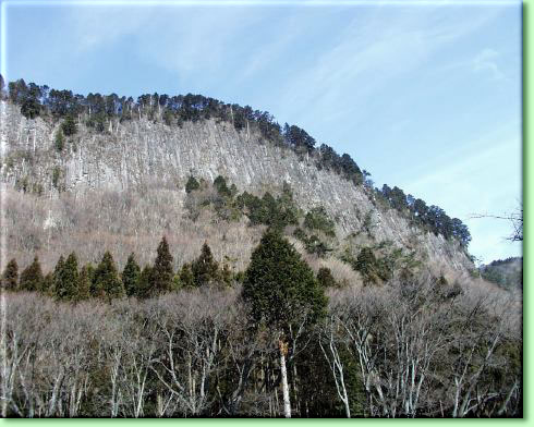 この辺りには、「屏風岩」と呼ばれる特徴的な岩がいくつか存在するようです。写真では少し分かりにくいかもしれませんが、その奇妙な景色は、確かに自然の神秘を感じさせます。四季折々で様々な表情を見せてくれるのだろうと想像が膨らみます。【屏風岩解説】屏風岩は国指定の天然記念物とのこと。ただ、この村へ向かう道中にも、似たような景色に出会うことができました。写真に写る穏やかな山並みが、屏風岩がいつも見ている景色なのでしょう。